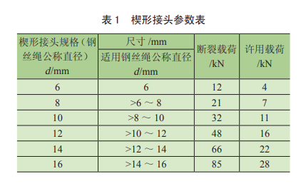 2)應(yīng)考慮相同抗拉強(qiáng)度較小直徑鋼絲繩使用的情況,當(dāng)使用較小直徑鋼絲繩時,選擇較小型號的楔形接頭會降低安全系數(shù),甚至無法使用。