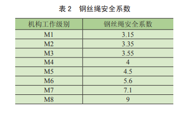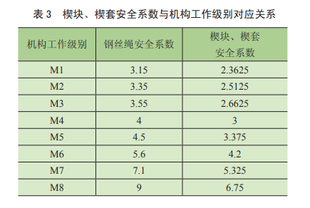 9.4.1.1.6條“用楔塊、楔套連接時,楔套應(yīng)用鋼材制造,連接強(qiáng)度不應(yīng)小于鋼絲繩破斷拉力的75%”、第6.3.2.3.2.2條鋼絲繩選用的最小安全系數(shù)法,運(yùn)動繩的安全系數(shù)與機(jī)構(gòu)工作級別對應(yīng)關(guān)系見表2。