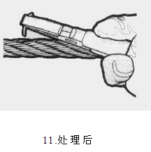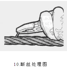 當鋼絲繩出現(xiàn)斷絲仍需進行使用時,應將斷絲及時處理(見圖10和圖11)??梢杂娩摻z鉗夾住斷絲頭部,前后反復彎折至鋼絲斷掉。經(jīng)過這樣處理,鋼絲斷頭將被夾緊在股繩之間,不會對鋼絲繩使用造成危害。當一個捻距內(nèi)斷絲數(shù)量達到外層鋼絲總數(shù)10%時,鋼絲繩必須更換。