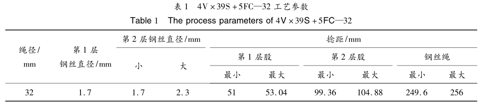 4V×39S+5FC-32鋼絲繩的工藝參數(shù)見表1。