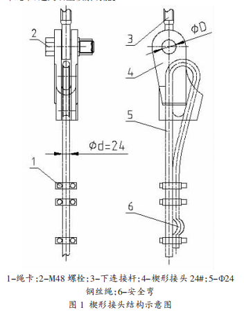 現(xiàn)選用鋼絲繩用索具楔形接頭結(jié)構(gòu)替換普通套環(huán)結(jié)構(gòu),并對其改型可行性進(jìn)行分析,具體結(jié)構(gòu)見圖1:楔形接頭結(jié)構(gòu)示意圖。此楔形接頭由楔套與楔組成,鋼絲繩裝入楔形接頭具有“自鎖”的功能,即鋼絲繩越拉越緊,不易從楔形接頭內(nèi)滑出,為安全起見,另在鋼絲繩的末端加設(shè)二個(gè)繩卡,起到雙重鎖緊功能。