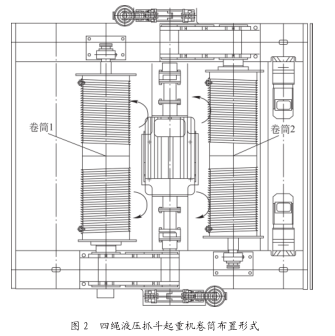 6.2鋼絲繩入槽擺動分析雖然交互捻鋼絲繩有抗扭作用,但其受到較大側(cè)向力時還是會發(fā)生轉(zhuǎn)動。如果鋼絲繩卷筒左向槽用右旋鋼絲繩,右向槽用左旋鋼絲繩可以有效地減小擺動。以四繩液壓抓斗起重機為例,布置形式見圖2。
