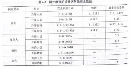 合理選取鋼絲繩安全系數(shù)是選擇計(jì)算提升機(jī)的一個(gè)重要因素。選取大的安全系教,即提高鋼絲繩最初強(qiáng)度(破斷拉力),雖能延長(zhǎng)鋼絲繩壽命,但在經(jīng)濟(jì)上不一定合理。因?yàn)樵诖蟮陌踩禂?shù)情況下,會(huì)帶來(lái)鋼絲繩直徑和鋼絲繩重量的增加。由于繩徑的增大,使提升設(shè)備的尺寸規(guī)格加大,因而增加投資成本。鋼絲繩重量的增加,使得卷筒或主導(dǎo)摩擦輪的靜拉力差加大,而導(dǎo)致電機(jī)功率的加大尤其深井提升更加明顯。因此,為了降低提升設(shè)備費(fèi)用,許多國(guó)家提出了對(duì)豎井多繩摩擦輪提升,隨井深而遞減的安全系數(shù)計(jì)算公式,見(jiàn)表4-3。國(guó)內(nèi)《煤礦安全規(guī)程》也采用了類(lèi)似的計(jì)算方法。