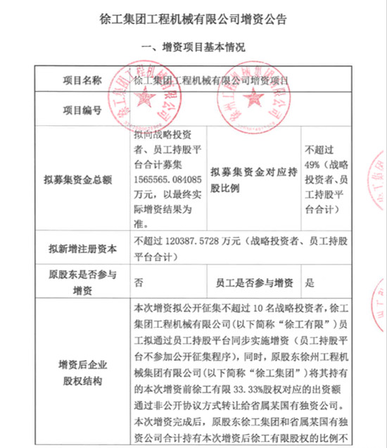 徐工集團工程機械有限公司(簡稱公司)按照2019年7月25日徐州市國資委審批通過的《徐工集團工程機械有限公司混合所有制改革試點實施方案》,于2020年6月24日將公司混合所有制改革涉及的增資項目在江蘇省產(chǎn)權(quán)交易所公開掛牌。具體內(nèi)容詳見江蘇產(chǎn)權(quán)市場網(wǎng)上披露的《徐工集團工程機械有限公司增資公告》。