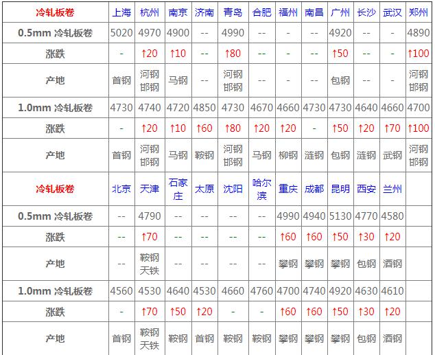 今日冷軋市場主流走強(qiáng),卷料在4680-4720元,冷板在4750元左右。據(jù)了解,國慶期間價(jià)格基本穩(wěn)定,商家多數(shù)休市,7-8日陸續(xù)有所值班經(jīng)營。而節(jié)前由于補(bǔ)跌幅度較大,現(xiàn)貨基本貼近成本售價(jià),下跌空間有限。綜合來看,預(yù)計(jì)短期冷軋卷板價(jià)格穩(wěn)中向上。