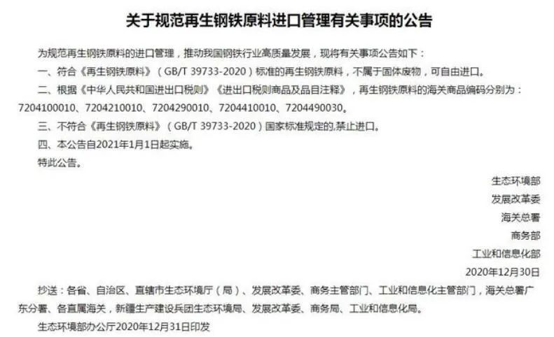 此外,生態(tài)環(huán)境部、國家發(fā)展改革委等五部門昨日聯(lián)合發(fā)布《關(guān)于規(guī)范再生鋼鐵原料進(jìn)口管理有關(guān)事項(xiàng)的公告》,公告稱符合《再生鋼鐵原料》國家標(biāo)準(zhǔn)的再生鋼鐵原料,不屬于固體廢物,可自由進(jìn)口。該公告自2021年1月1日起實(shí)施。國信金陽資本有限管理公司黑色產(chǎn)業(yè)鏈部門經(jīng)理?xiàng)罾诟嬖V記者,放開廢鋼進(jìn)口是優(yōu)化鐵元素供給的有效措施之一,也是緩解上游鐵元素供給集中度過高的重要措施措施之一,和境外礦山權(quán)益礦一樣,都具有戰(zhàn)略作用;廢鋼在一定條件下作為鐵礦石的替代品,無論是經(jīng)濟(jì)層面,還是工藝層面,都具有“緩沖池”功能。